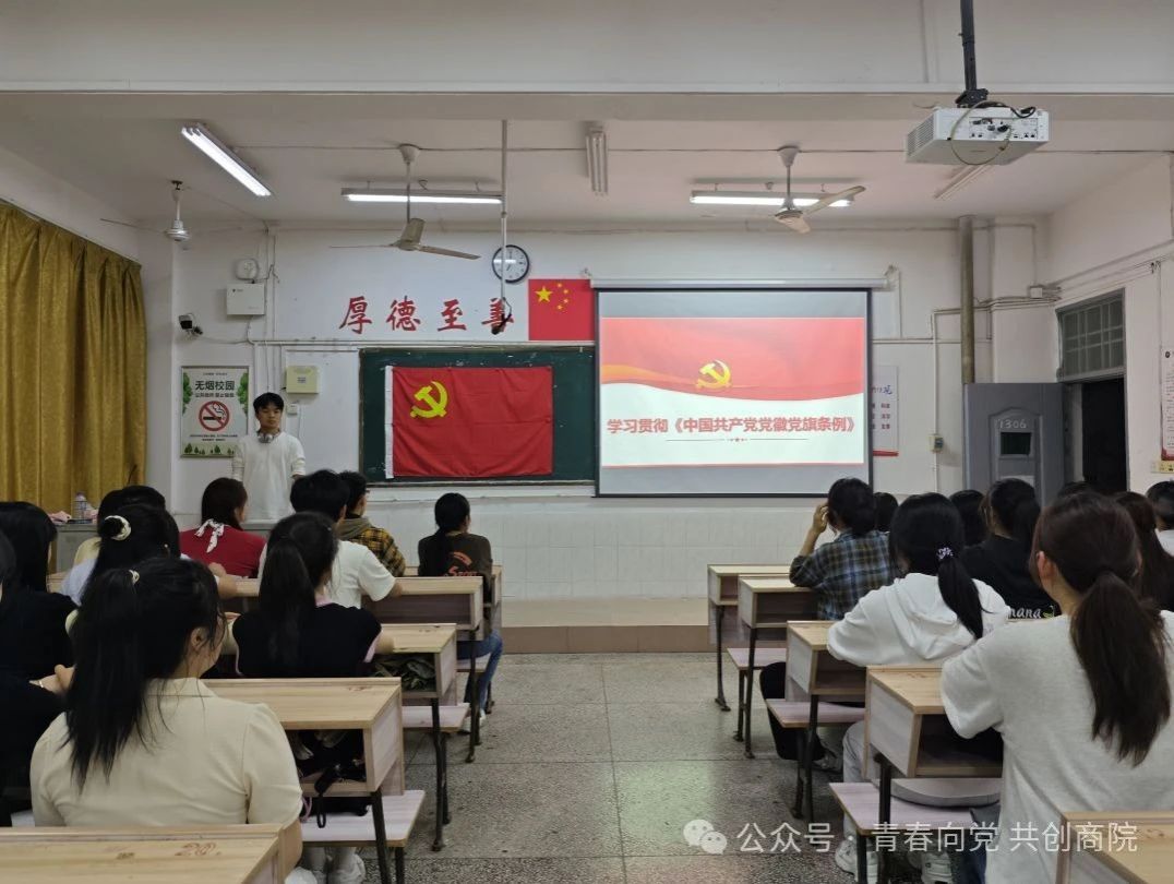 为深入落实全面从严治党要求,维护党徽党旗尊严,规范使用党徽党旗 。2025年04月21日18:00-20:00,商学院学生党支部在跬步楼1306教室开展“深入学习《中国共产党党徽党旗条例》,规范党徽党旗使用”主题党日活动。本次活动由学生党员张俊主讲,商学院部分学生党员及入党积极分子参与。