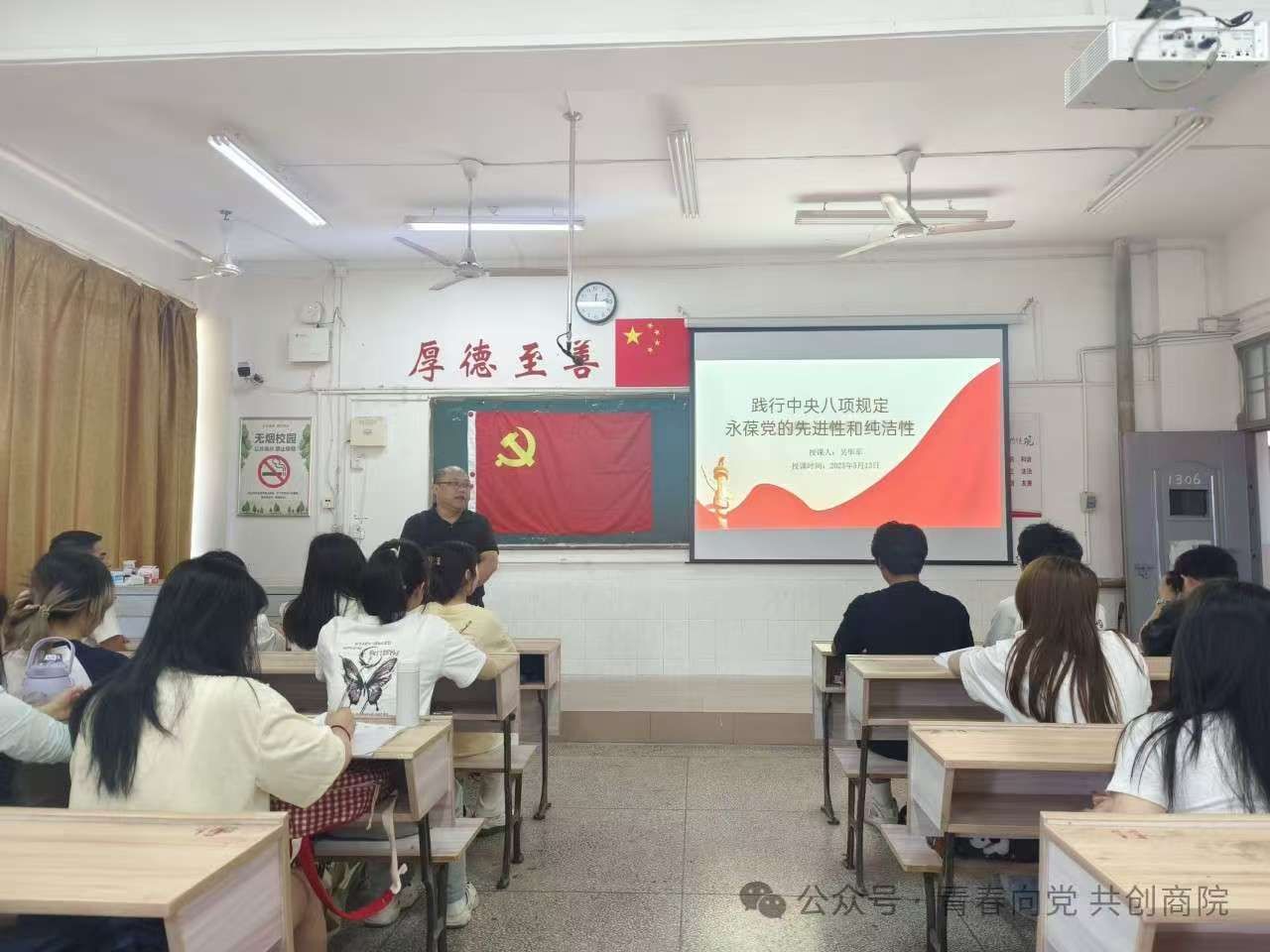 为进一步深入贯彻中央八项规定精神学习教育,大力弘扬清正廉洁之风,以实际行动维护党的先进性与纯洁性。2025年5月13日12:10,商学院学生党支部在跬步楼1306教室开展“践行中央八项规定,永葆党的先进性和纯洁性”主题党课。本次党课由商学院党委副书记吴华军主讲,商学院部分学生党员及入党积极分子参与。