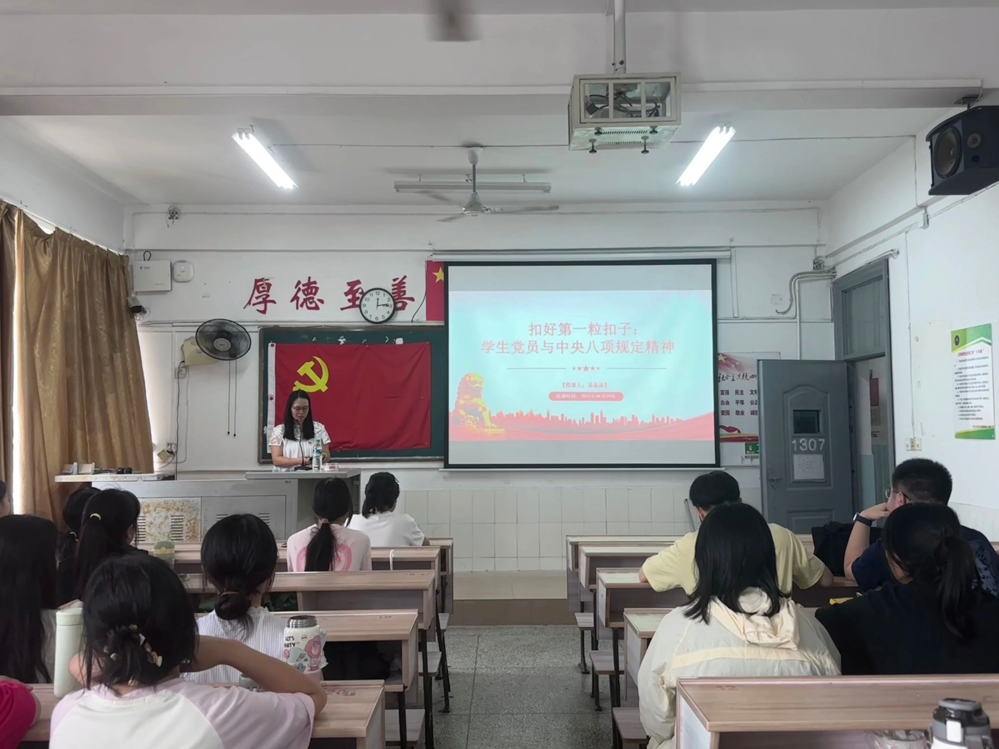 为深入贯彻中央八项规定精神学习教育,引导我院学生党员及入党积极分子树立正确的价值观和纪律意识,以实际行动维护党的先进性和纯洁性。2025年6月10日12:10,商学院学生第一党支部在跬步楼1307教室开展“扣好第一粒扣子:学生党员与中央八项规定精神”主题党课。本次党课由商学院学生第一党支部书记易晶晶主讲,商学院学生第一党支部部分学生党员及入党积极分子参与。