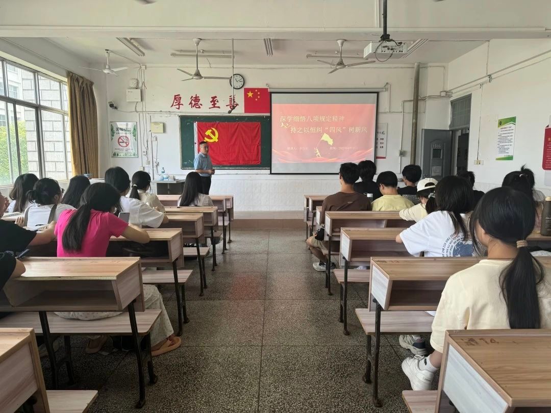 为深入贯彻中央八项规定精神学习教育,进一步推动组织作风建设。2025年6月16日11:10,商学院学生党支部在跬步楼1306教室开展“深学细悟八项规定精神,持之以恒纠‘四风’树新风”主题党课。本次党课由商学院副院长李自连主讲,商学院部分学生党员及入党积极分子参与。