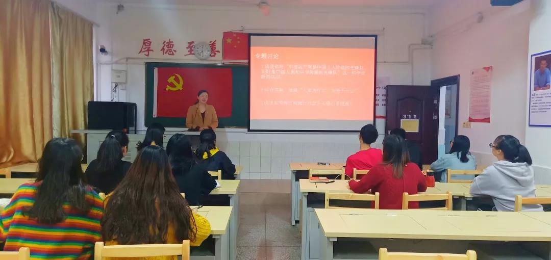 为适应党员发展要求,教育引导我院发展对象深刻学习领会习近平新时代中国特色社会主义思想的精神实质和丰富内涵,深入了解党的性质,商学院学生党支部于2019年11月14日下午5:30在跬步楼1311开展了发展对象培训专题讨论活动。本次活动由商学院学生党支部书记朱艳清主持。