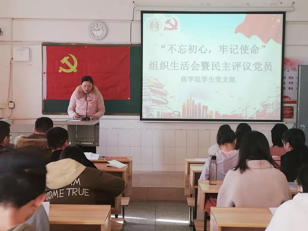 为了深入学习贯彻习近平新时代中国特色社会主义思想,进步推动支部建设,加强党员理想信念教育,提升党员政治素质、理论水平和党性修养。2019年12月6日中午1点,商学院学生党支部在跬步楼1309开展了“不忘初心,牢记使命”组织生活会暨民主评议党员会议。本次会议由学生党支部书记朱艳清同志主持,出席本次会议的有学生党支部全体教师党员和学生党员。