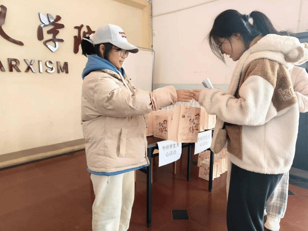 为鼓舞我院考研学子士气,在硕士研究生考试中创造佳绩,2024年12月18日,商学院团委学生会在跬步楼一楼大厅开展了“橙光暖韵,研路臻情”考研送温暖活动。考试临近,商学院团委学生会精心准备“考研加油包”,希望在寒冬与紧张备考的双重压力下,为每一位奋斗在考研前线的学子送上最诚挚的关怀与支持。