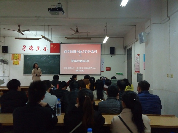 为提高企业整体营销水平,提升员工营销能力,助力地方经济发展。2018年11月16日,商学院团总支联合萍乡市广电团委在跬步楼1114室举办市场营销培训班。本次培训由电子商务研究中心办公室主任冯卉萍老师担任主讲。