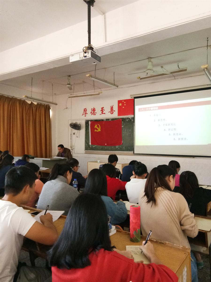 接下来,韩书记用课件的方式向同学们展示了十九大报告的主要内容,如对党章进行部分修改;选举产生了以习近平同志为核心的新的中央政治局常委;听取并审议十八届中央纪律检查委员会工作报告;选举产生十九届中央纪律检查委员会等主要十九大报告主要内容。