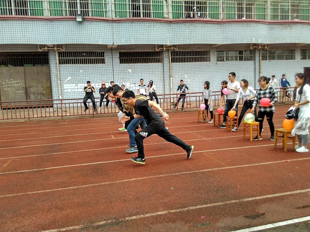 同学们陆陆续续到达田径场。点到后,准备做游戏。共有两个游戏,并且都是围绕气球进行。第一个游戏开始,只听主席一声令下,男生冲到50米远的距离背起女生,转三圈后冲回来把凳子上的气球挤爆。最后完成任务的一组接受了残酷的喝辣椒水的惩罚。第二个游戏是由两个女生或两个男生进行配合。两人跑到50米左右远的地方,接过球,两人背靠背,球在中间,两个人必须跑回起点的时候才能把气球挤爆。这个游戏最考验耐心了。如果半路上球就被挤爆了,就要返回去拿另外一个气球。最后一个完成任务的那一组同样要接受喝辣椒水的惩罚。游戏中,同学们传递友谊,合作愉快,争先恐后,不时哈哈大笑。 在欢悦的气氛中,游戏一直持续到下午一点半才结束。