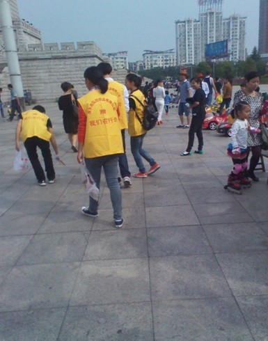 那天上午,义工团成员身穿义工服,配带工作证,分成三队。一队在斑马线做文明劝导,引导过马路的行人遵守交通规则。其余两队在秋收起义广场清理游客们丢弃的垃圾。并劝导游客们要爱护环境。在草坪上,人行道上闪烁着黄色的身影,义工团成员们左手提着垃圾袋,右手套着塑料袋,在喧闹的广场上形成一道亮丽的风景线。文明劝导队的义工成员们用她们的微笑与耐心劝导着闯红灯的行人。