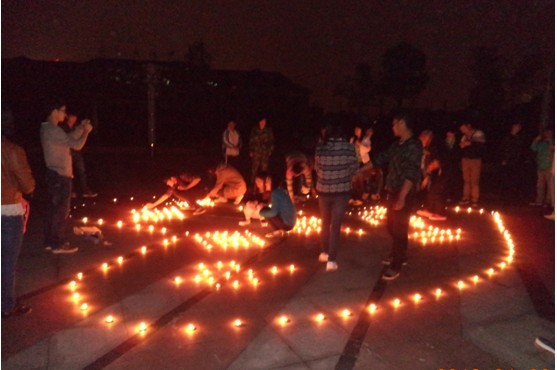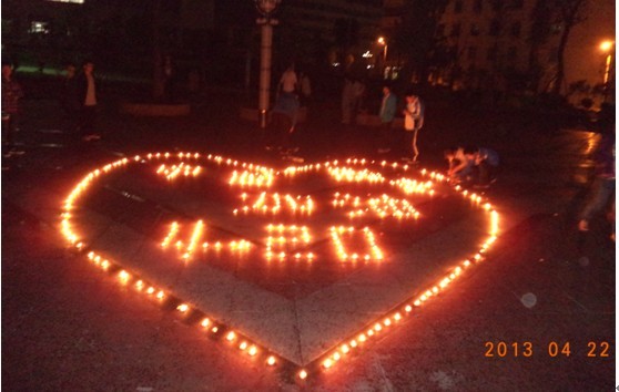 2013年4月22日星期一晚,经管系12级经管班,电商班,报关班自发联合举办在若水广场开展为雅安地震受难人员祈福活动。
