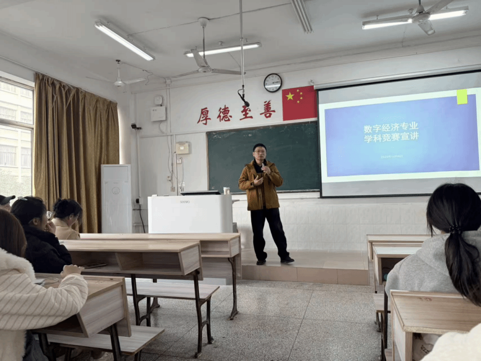 2025年12月8日下午,“数字经济专业学科竞赛专题宣讲会”于跬步楼1306教室成功举办。本次宣讲会由崔发生老师主持,王坤老师担任主讲,数字经济专业教研室主任张子龙、钟诚等多位老师和数字经济专业2025级全体学生参与,旨在系统介绍专业竞赛体系,为新生搭建连接理论知识与实践应用的关键桥梁。