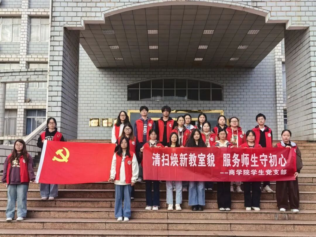 为深入学习贯彻党的二十届四中全会精神,推动我院学生党员及入党积极分子在实践中践行奉献精神,切实发挥先锋模范作用。2025年11月4日下午16:10-17:00,商学院学生党支部在跬步楼教室开展“清扫焕新教室貌,服务师生守初心”志愿服务活动,商学院部分学生党员及入党积极分子参与。