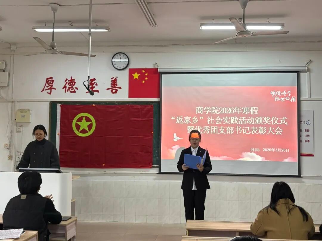 青春逐梦,不负韶华;表彰先进,砥砺前行。为总结实践成果、树立优秀典型,商学院寒假返家乡表彰大会暨优秀团支部书记表彰大会于3月20日中午在跬步楼1306教室顺利召开。商学院团委书记易晶晶老师、学生会主席沈佳敏、学生会代表、各部门部长及全体优秀志愿者、团支部书记齐聚一堂,共同见证属于青年榜样的荣耀时刻。