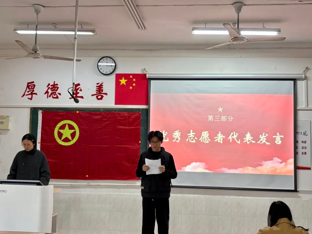 表彰仪式结束后,优秀志愿者代表上台发言。他结合自身返家乡实践经历,分享了服务过程中的收获与成长,讲述了奉献带来的温暖与感动,也表达了今后继续投身志愿服务、勇担青年责任的坚定决心。