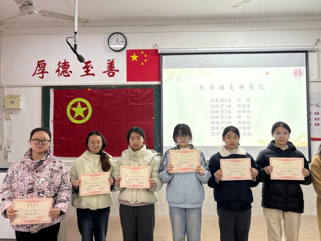 优秀团支部书记:23电子商务1班:江婷、24财务管理1班:何雨蔓、24财务管理2班:刘佳怡、 24旅游管理与服务教育1班:钟巧、 24知识产权1班:周雨欣、 25电子商务1班:余洲赘、 25市场营销1班:白艾瑶