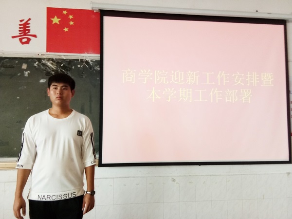 2018年9月4日中午11点50分,商学院迎新工作安排暨本学期工作部署大会在跬步楼1306顺利举行。本次大会重点部署2018年迎新工作,并对学生会本学期重点工作做了安排。会议由商学院17届学生会主席彭铖来主持,学院党总支副书记尹金书记、商学院党支部书记易晶晶书记、商学院团总支书记朱艳清老师、商学院辅导员曾竹老师及学生会全体成员参加了本次大会。