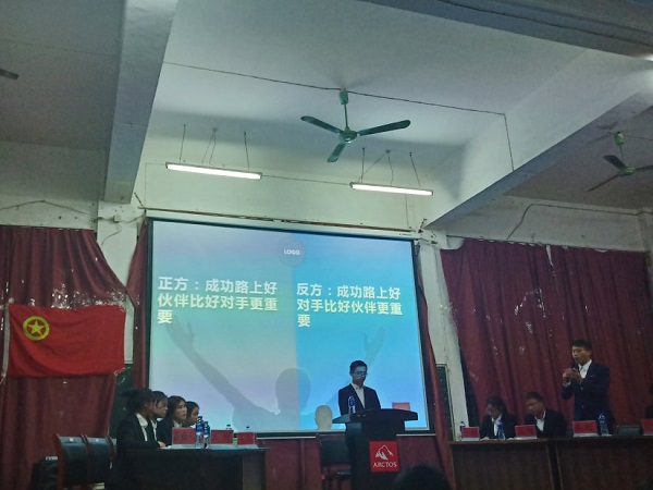 正方辩题为:成功路上好伙伴比好对手更重要。反方辩题为:成功路上好对手比好伙伴更重要。正方辩手们先后举例,刘备不辞辛苦为诸葛孔明三顾茅庐和俞敏洪邀请同学携手共进新东方使己方论点更加明确。反方也不甘落后,用古代《孟子》和近代“养狼计划”的例子来加深本方论点,赛场气氛紧张热烈,双方辩手你来我往、侃侃而谈,场下观众激情澎湃、掌声连连响起。自由辩论环节将比赛气氛再次推向高潮,现场气氛迅速升温,精彩不停,掌声不断。最后,文侃教授对此次辩论赛过程给予了一定的好评并且指出反方辩手辩论时的不足,欧阳启红同学也对辩手们进行了鼓励,相信商学院今后的辩论赛一定会越来越精彩!