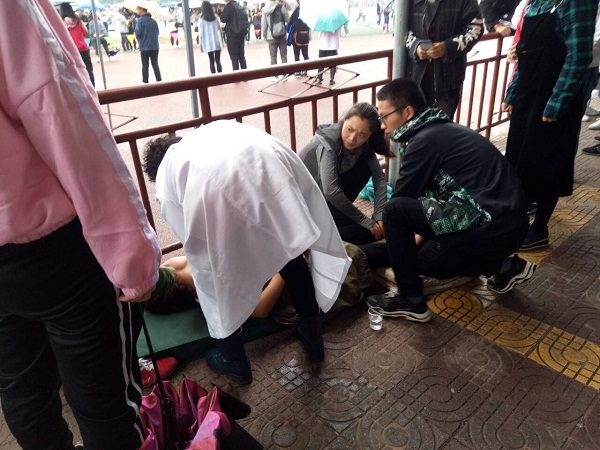2018年10月25日下午,下着淅淅沥沥的小雨,在女子1500米长跑的赛场上,运动健儿们正进行着紧张激烈的比赛。当比赛进行到一半时,一位来自初教学院的女生因体力不支晕倒在赛场上。商学院的同学们连忙将她扶起,扶到商学院站点。然而女孩昏迷不醒,来自商学院18市场营销2班的张鹏华同学将女生背起,冒着小雨冲向医疗点。途中女孩不小心滑落,张鹏华同学便将女生抱起跑至医疗点。期间,张鹏华同学以及商学院其他同学寸步不离的照顾着这位女生。这样的精神着实令人感动。