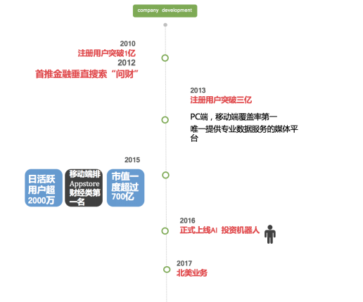 截止到2017年,同花顺金融注册用户超过3.1亿,与国内合作券商占90%以上;同花顺APP累计下载超2.5亿,月活用户超6000万;i问财机器人投顾全面上线,支持客服、投顾咨询、百科、资讯等多领域,达到每日百万次对话;合作近1000所高校,累计超过180万大学生,使用同花顺高校版金融实验室 、Mindgo量化交易平台、 大金融数据终端进行课堂教学及研究......