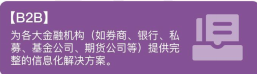 我们具有行业内最为齐全的产品线及完整的产业战略布局,涵盖了金融信息服务、移动证券平台、基金销售、人工智能投资、大宗商品经纪等业务领域,通过创新的产品和服务,持续满足国内90%证券机构与近两亿的个人客户的需求。