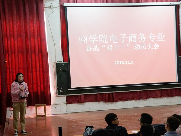 为进一步鼓舞同学们的士气,振奋精神,做好充分的准备备战“双十一”期间的实训任务。商学院于2018年11月9日下午1时在跬步楼1115举行备战“双十一”电商实训动员大会。受邀参加本次动员大会的有:商学院院长文正再、商学院党总支书记韩芳文、副院长李自连、党总支副书记尹金、珀莱雅公司陶经总经理、电子商务专业相关老师及参加实训的同学。