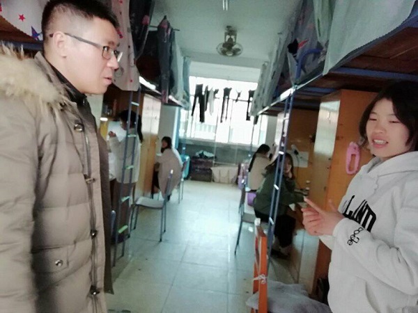 10月18日下午5时,商学院党总支副书记尹金、学生党支部书记易晶晶、辅导员赖金文、曾竹老师在相关职能部门负责人陪同下来到五栋女生寝室看望慰问同学们。