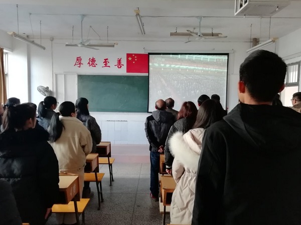 在直播播放之前,商院领导老师已早早入座。当直播开始时,每位领导老师用掌声迎接屏幕中习近平主席的出场并认真投入到习近平主席的讲话当中。在习近平主席讲述完中国改革开放前、后中国的发展状况后,国歌奏响!全体领导老师起立默唱国歌,歌声透露着肩负民族兴盛的使命和民族伟大复兴的自豪。改革开放前,有衣食温饱的烦恼,但是改革开放40年的今天有中华民族傲立世界舞台!