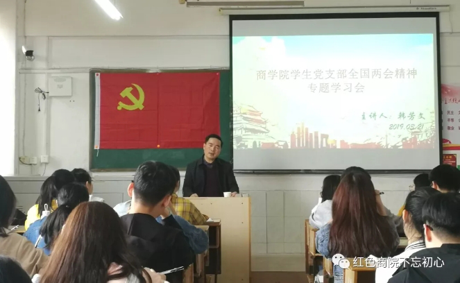 为了更好学习贯彻“两会”精神,商学院学生党支部于2019年3月21日中午12:40在跬步楼1309召开“学习两会精神”专题学习会,参加此次会议的有商学院全体在校学生党员及入党积极分子,会议由商学院党总支书记韩芳文书记主持。