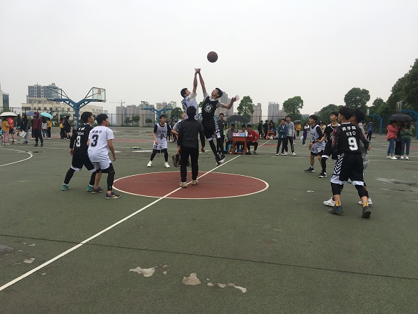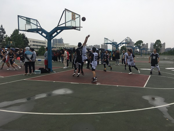 本场比赛的对阵双方分别是商学院代表队和文学院代表队。由于本次比赛是初赛,比赛开始前,球场的周围已经围满了前来观看的同学。参加比赛的队员们也热情高涨,跃跃欲试,赛前还以接力投篮的方式热身。随后,激烈的篮球赛开始了。