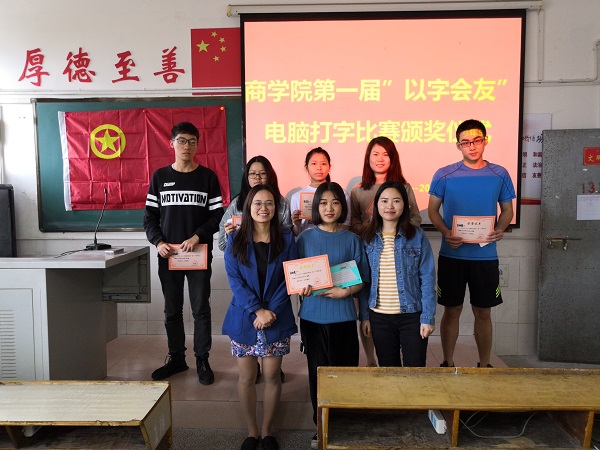 由商学院学生党支部书记易晶晶老师和辅导员曾竹老师为选手颁奖!易晶晶老师做了简短的点评,并希望同学们更加积极地提升自己的综合素质,为将来的就业做准备。最后,获奖选手与老师合影留念,本次“以字会友”打字比赛圆满结束。