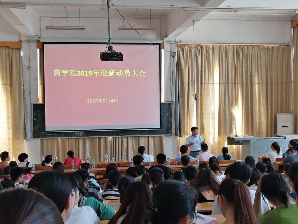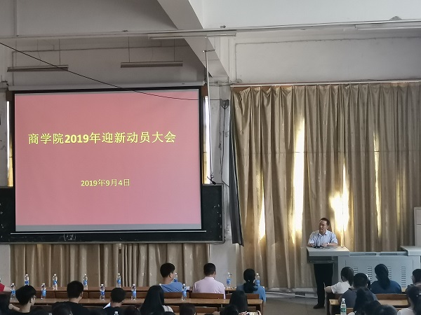 2019年9月4日下午13:00,商学院在跬步楼1101室举行迎新动员大会。本次大会邀请的嘉宾有商学院党总支书记韩芳文,商学院院长文正再,商学院党总支副书记尹金,商学院团总支书记朱艳清,商学院学生党支部书记易晶晶,商学院辅导员曾竹,赖金文,杨柳,李晨和胡桑老师,2019级班主任以及商学院全体学生干部。本次会议由商学院团总支书记朱艳清主持。