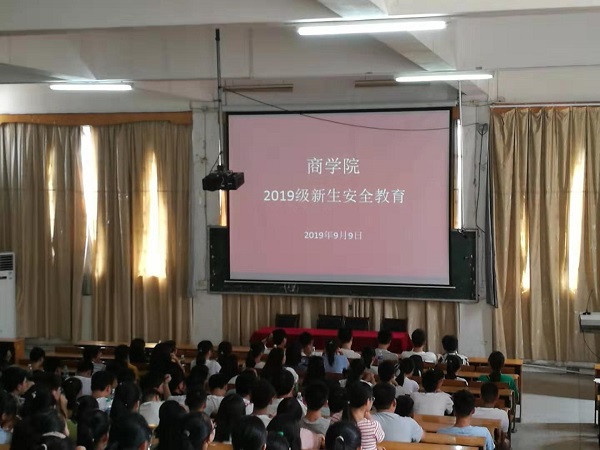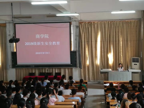 为增强商学院2019级新生的安全意识和自我防护能力,加强学生的安全教育和管理,2019年9月9日,商学院党总支副书记尹金、商学院学生党支部书记易晶晶在跬步楼为新生集中进行了入学安全教育。
