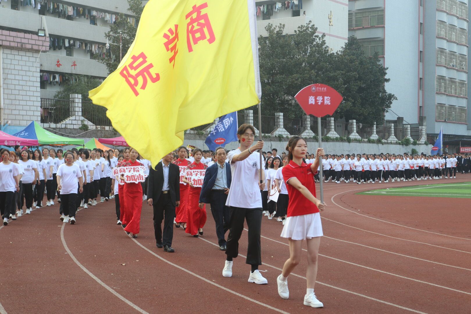 在热情洋溢的进场音乐中,商学院院长黄绍斌、党总支书记曾敏带领着商学院学子方阵,喊着响亮的口号,带着商学院吉祥物——财神爷,精神抖擞的步入运动场。