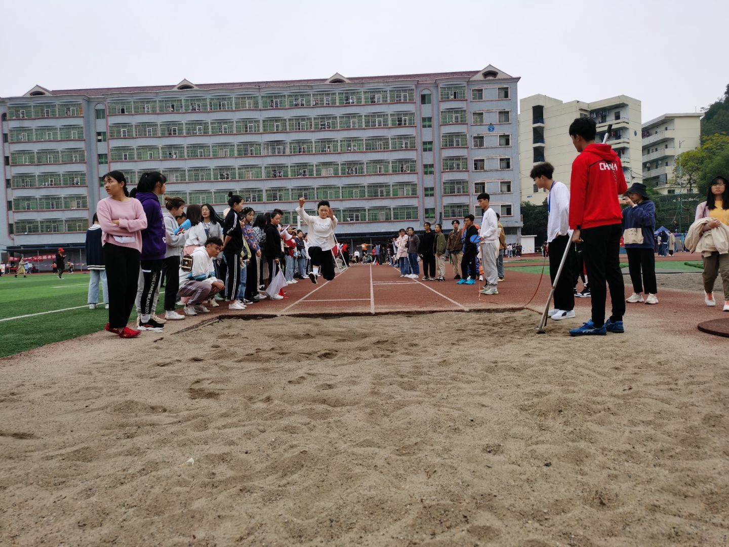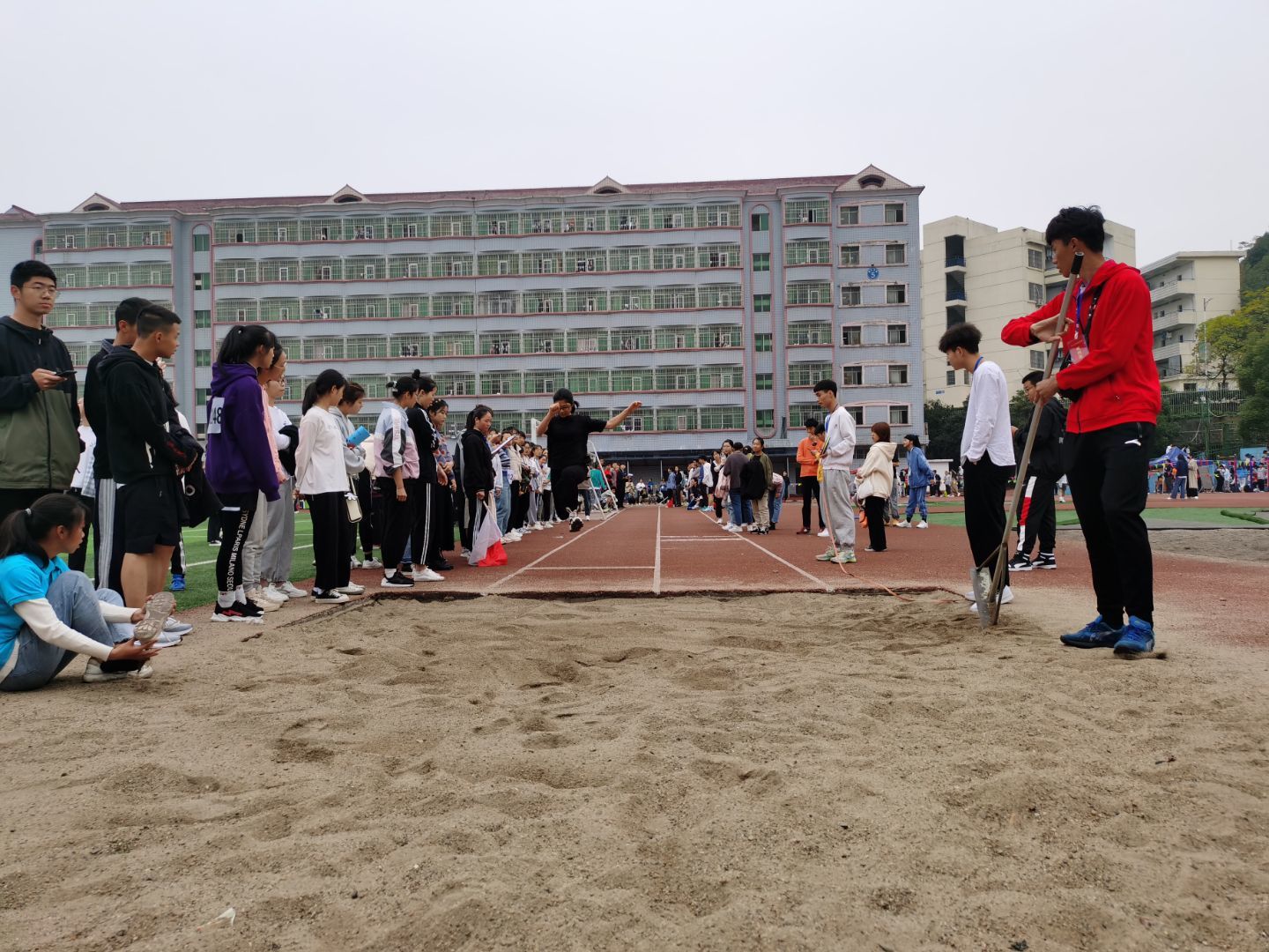 比赛未开始,赛场周围就围满了观众。比赛开始后,观众的加油声与呐喊声久久不息。赖淑蝶同学经过短暂的热身后,只见她弓着腰,双手紧握拳头,两眼盯着前方,腿向前伸展,在空中划出了一道弧线,落在了松软软的沙子里。她以精彩的表现获得了第四名的好成绩。