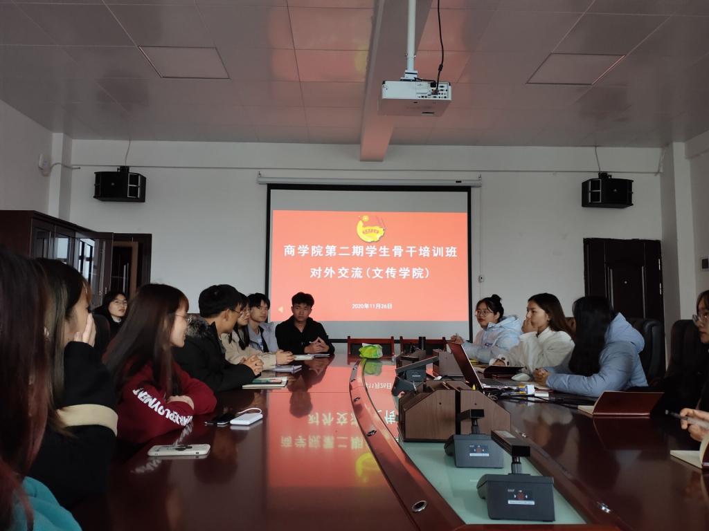 萍乡学院2020年11月26日12:20,在跬步楼1204会议室组织商学院第二期骨干培训班对外交流会议。本次对外交流的对象是人文与传媒学院,此次会议主讲人是商学院团总支书记朱艳清老师,会议内容包括学生干部的工作方法、工作重心及工作经验的交流与分享。