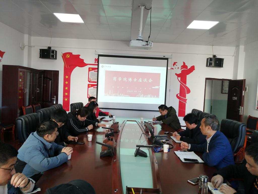 2021年1月14日,商学院在跬步楼1204召开博士座谈会。参加座谈会的有商学院党总支书记曾敏、院长黄绍斌、副院长李自连、办公室主任张铭智以及商学院全体博士老师。