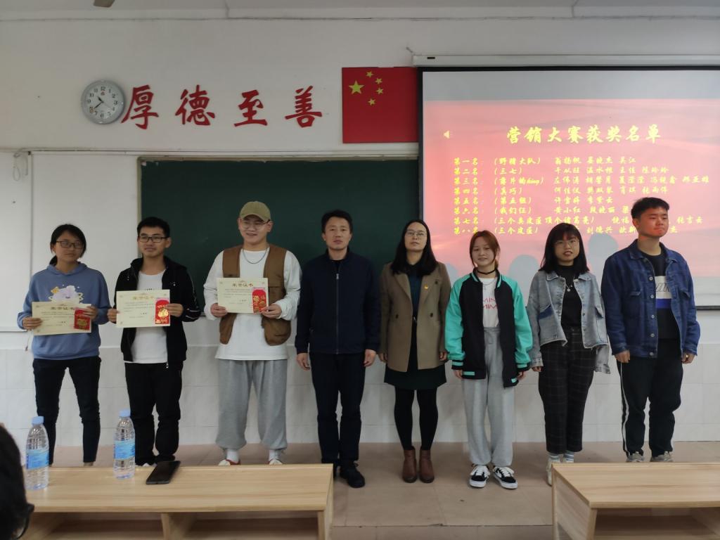 会议开始之初,主持人对各位老师、学长学姐的到来表示衷心地感谢,大会第一项宣布了本次苦荞薄片营销大赛获奖小组名单,获得第一名的是野猪大队小组,第二名是三七小组,第三名是薄片的king小组,曾敏书记为获奖小组的代表颁奖,这次获奖的小组付出了他们辛勤的努力,得到了他们应有的回报。大会第二项,主持人宣布了本次脱口秀大会获奖名单,一等奖为20市营2班曾庆隆,二等奖为19电商2班吴煜超,三等奖为20市营2班左伟涛,他们在脱口秀大会上用幽默的口语赢得了观众的掌声,也获得了优秀的成绩。此次为他们颁奖的是商学院辅导员易晶晶老师,并在最后与获奖同学进行了合影留念。