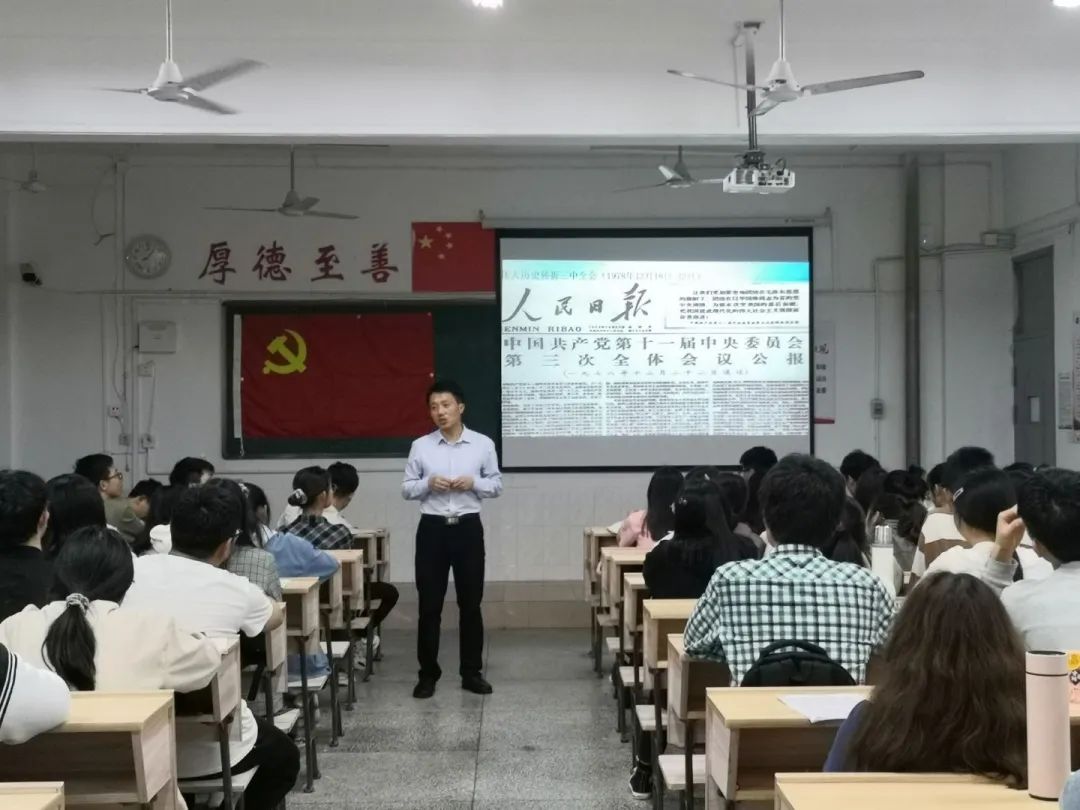 接着,是此次党课教育活动的第二阶段:党史教育。曾敏主要为大家讲解了以十一届三中全会为起点的改革开放史,举例了改革开放初期人们的生活状况,对比了改革开放初期与当代的社会发展现状,让学生们深刻认识到“改革开放”,坚持“一个中心,两个基本点”的重要性。还从南方谈话、十四大、十五大、十六大、十七大中谈到了中国的发展,让学生们深刻感受到祖国的变化,提升国家自豪感。最后,曾敏表达了自己对学生们寄予的殷切希望。至此,本次党课学习教育活动圆满结束。