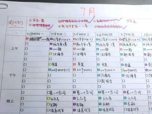 在备考过程中,袁茹玥准备得十分充分。她说,对于英语政治、专业一专业二分门进行别类做好计划。将自己要背的内容、范文的时间安排好,把每个月的计划安排出来。做完这些,就要制定每天的微观计划,这样复习的目标就会非常明确。只要一步一步高效率完成自己的计划,肯定是能考上的。