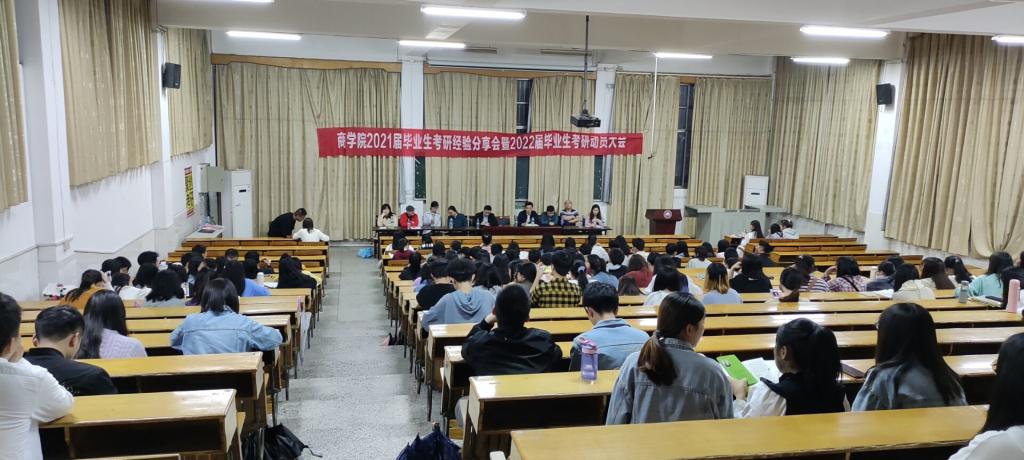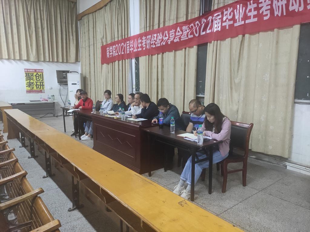 为了激发同学们学习的热情,鼓励我院本科生积极准备考研,商学院于2021年5月18日晚19:30在跬步楼1101教室召开了考研动员大会。此次会议邀请了商学院党总支书记曾敏,商学院院长黄绍斌,商学院副院长李自连,张子龙博士,余慧博士,王剑博士以及商学院17级考研成功的学生占文清、袁茹玥、苏洁三位同学出席考研动员大会。
