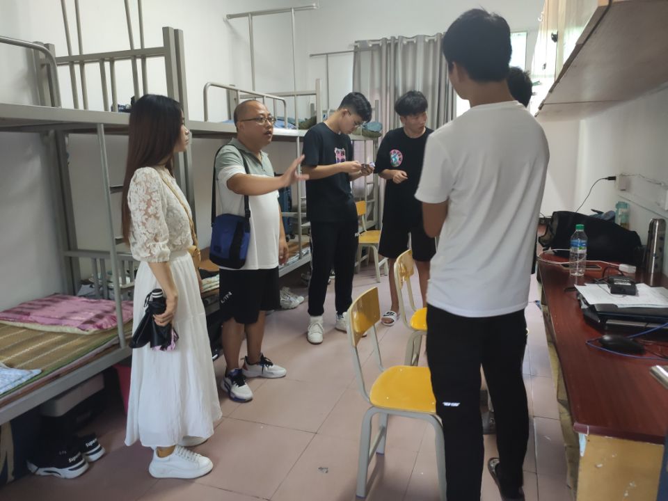 2021年9月12日下午,为深入了解新生入住情况,进一步加强管理,创建和谐、文明的寝室环境及尽早发现和解决学生寝室生活中存在的问题,商学院领导老师们下寝了解学生寝室情况。参与此次下寝活动的领导老师有:党总支副书记吴华军,辅导员吴陈舒、杨丽梅。