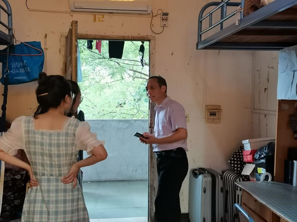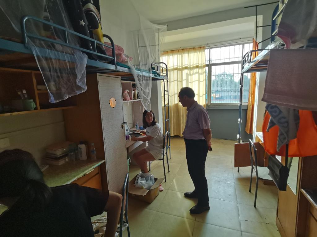 老师首先查看新生的住宿环境及宿舍安全状况,确保新生住得安心,以尽快适应大学生活。随后,老师与新生进行亲切交谈,仔细询问新生对宿舍环境、居住条件是否适应,家庭经济状况怎样。老师要求新同学务必注意财物安全、用水用电安全、人身安全;要求新同学加强内务清洁管理,保持宿舍环境卫生。老师勉励同学们勤奋学习、努力向上,培养良好的生活习惯,营造良好的学习氛围,做文明的大学生,为今后更好地适应社会打下坚实基础。