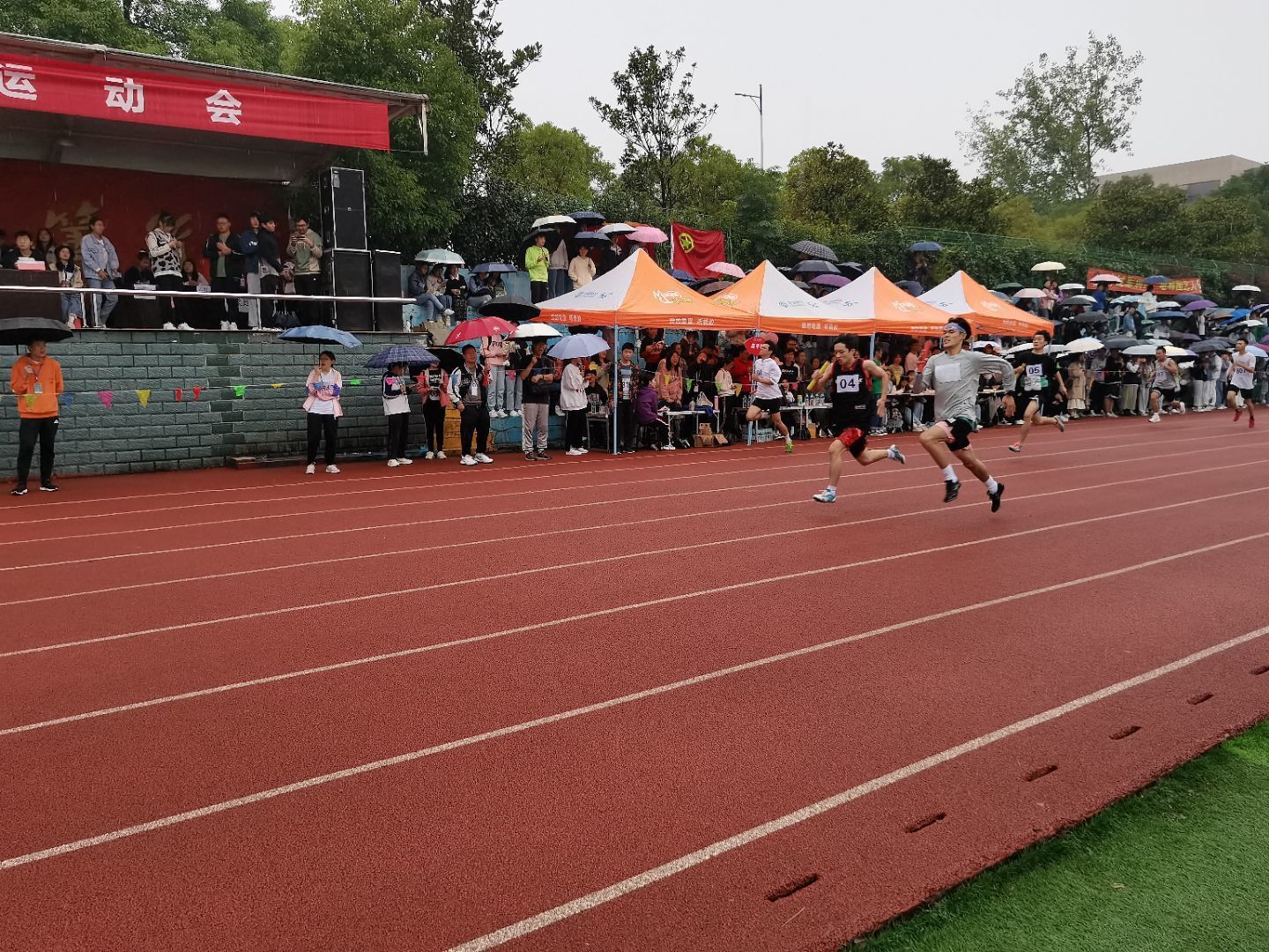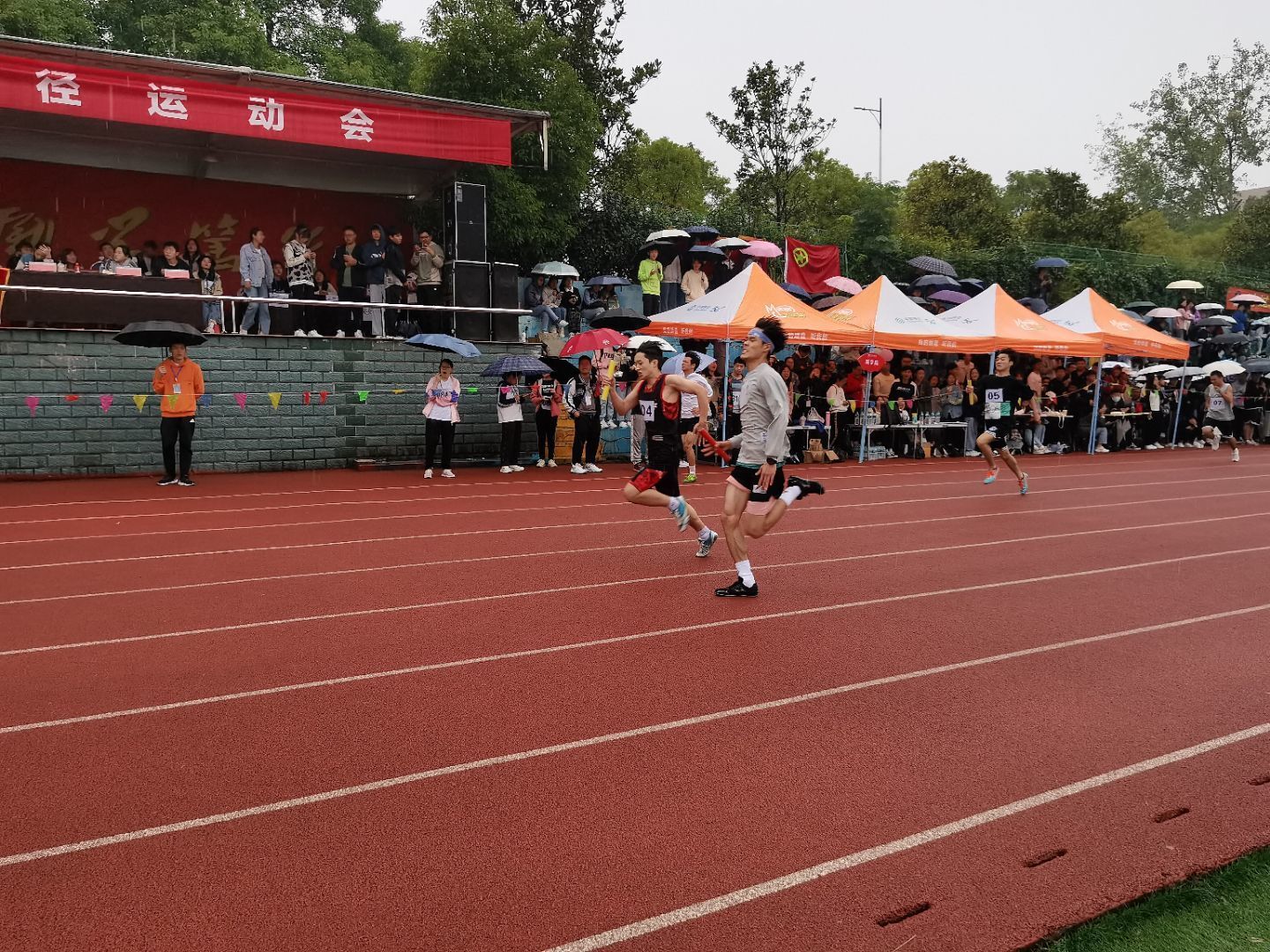 各项比赛正在如火如荼地进行着,运动员们身挂号码牌,紧握拳头,已经摆好了姿势蓄势待发;场外的观众们也已经做好加油的准备;就连摄影组的成员们也拿起了相机等候时机。过了漫长的等待期,枪声终于响起了,运动员们开始飞跑了起来,观众们立刻变身啦啦队。商学院的运动员们奋力奔跑,带着必胜的信心向终点跑去。最终,在振聋发聩的加油声中,最后一棒的运动员冲过终点线,斩获4×100米决赛的第二名。
