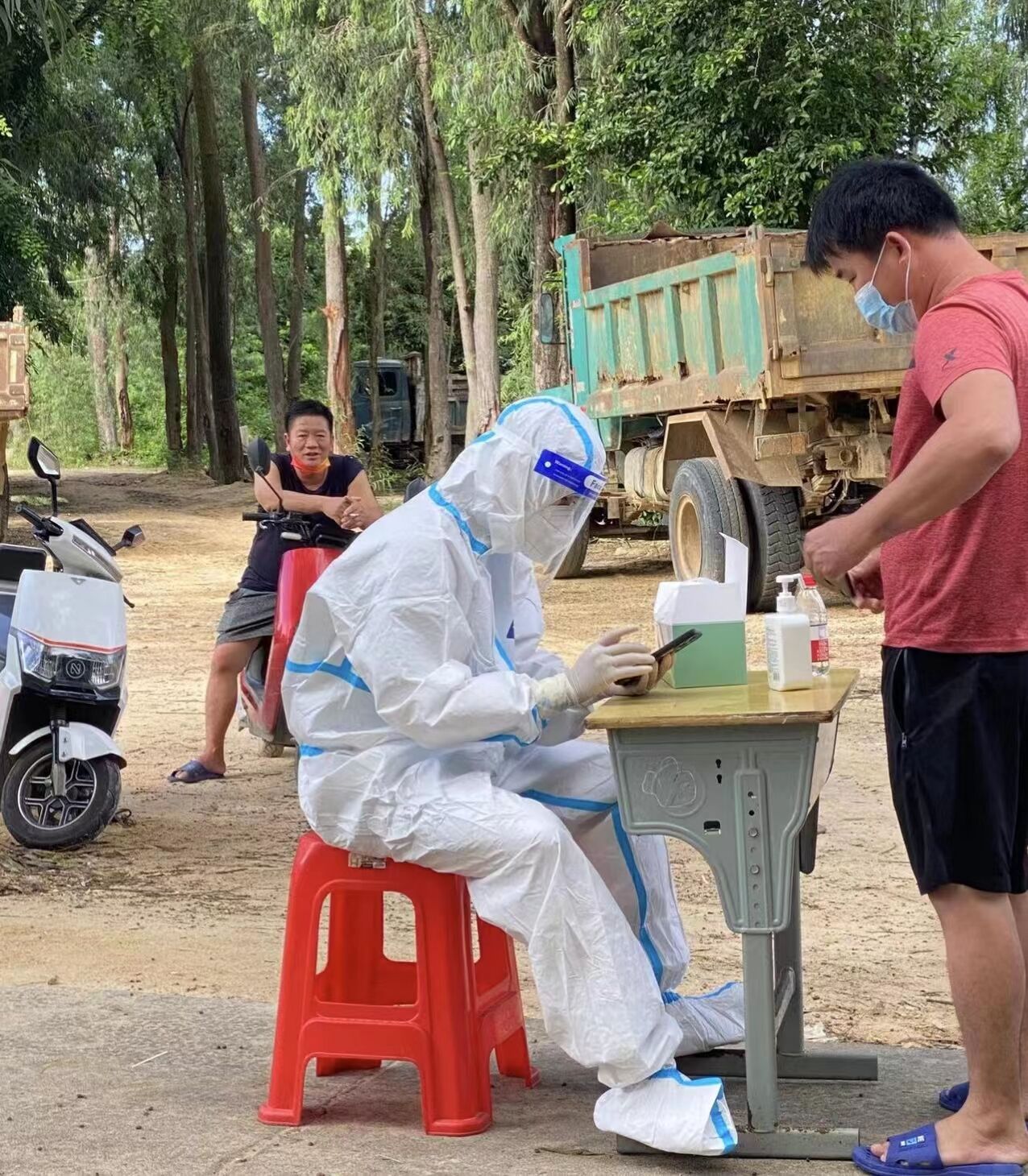 每天早晨6:30,她会和其他志愿者一同去居委会领取所需物资,并按要求提前到达了指定地点儋州市白马井镇南庄村做准备工作,等待医护人员的到来。在村委会领导的安排下,她当天负责给村里部分没有手机的老年人用身份证登记核酸检测并帮他们打印二维码的工作。穿好了防护服后,她便开始登记信息。结束一天的工作之后,陈振乖同学脱下防护服,脸上已经被口罩压出了痕迹,口罩绳子压住的地方痛感剧烈,头发更是被汗水浸湿,整个人仿佛从桑拿房出来了一样,冒着热腾腾的气。在她看来,虽然志愿过程疲惫不堪,但她毫无怨言,因为此次志愿活动意义非凡。