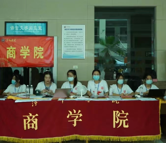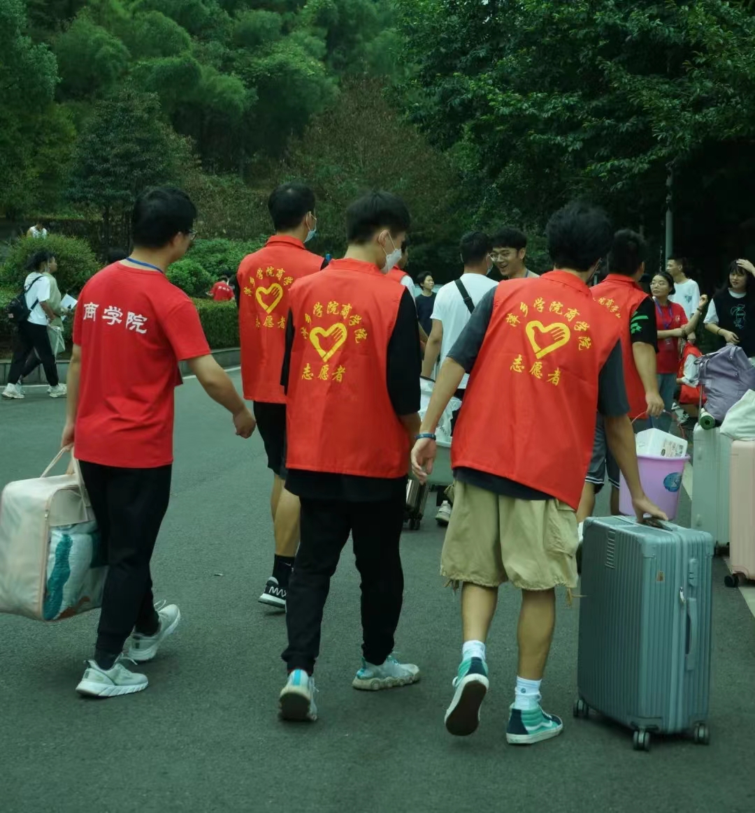在前往图书馆的途中,工作人员会细心地告知新生入学的注意事项,不要轻易听信他人的推销。进入图书馆,工作人员便引导新生前往商学院签到处,领导和老师们耐心地为新生排忧解难,提供无微不至的关心。经过一系列的流程后,工作人员便马不停蹄带领新生前往宿舍。新生看着学长学姐早已湿透的后背,眼神中满是感激,羞涩地说道:“谢谢学长学姐!你们辛苦了!”言有尽而意无穷!