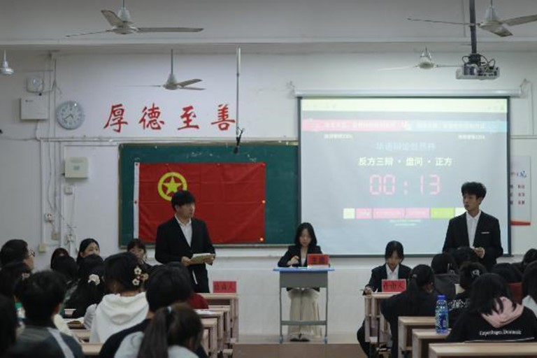为了丰富大学生课余生活,提高当代大学生的语言表达能力,培养当代大学生的团结协作能力,2023年3月12日晚7:00,商学院于跬步楼1306室举办了22级班级辩论赛。