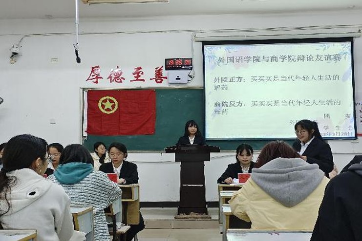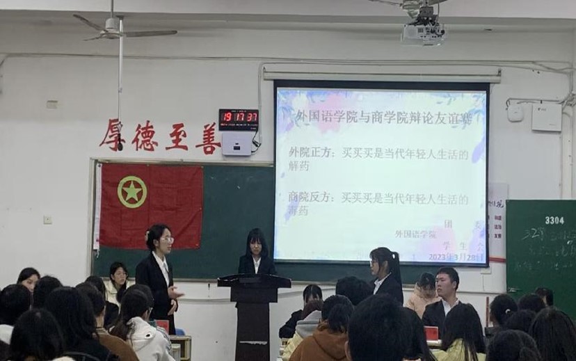 为提升大学生思辨能力、人文素养和综合素质,培养团队协作和创新精神,展现当代大学生的精神风貌,2023年3月28日晚7:00,商学院和外国语学院于英华楼3304室举办辩论友谊赛。