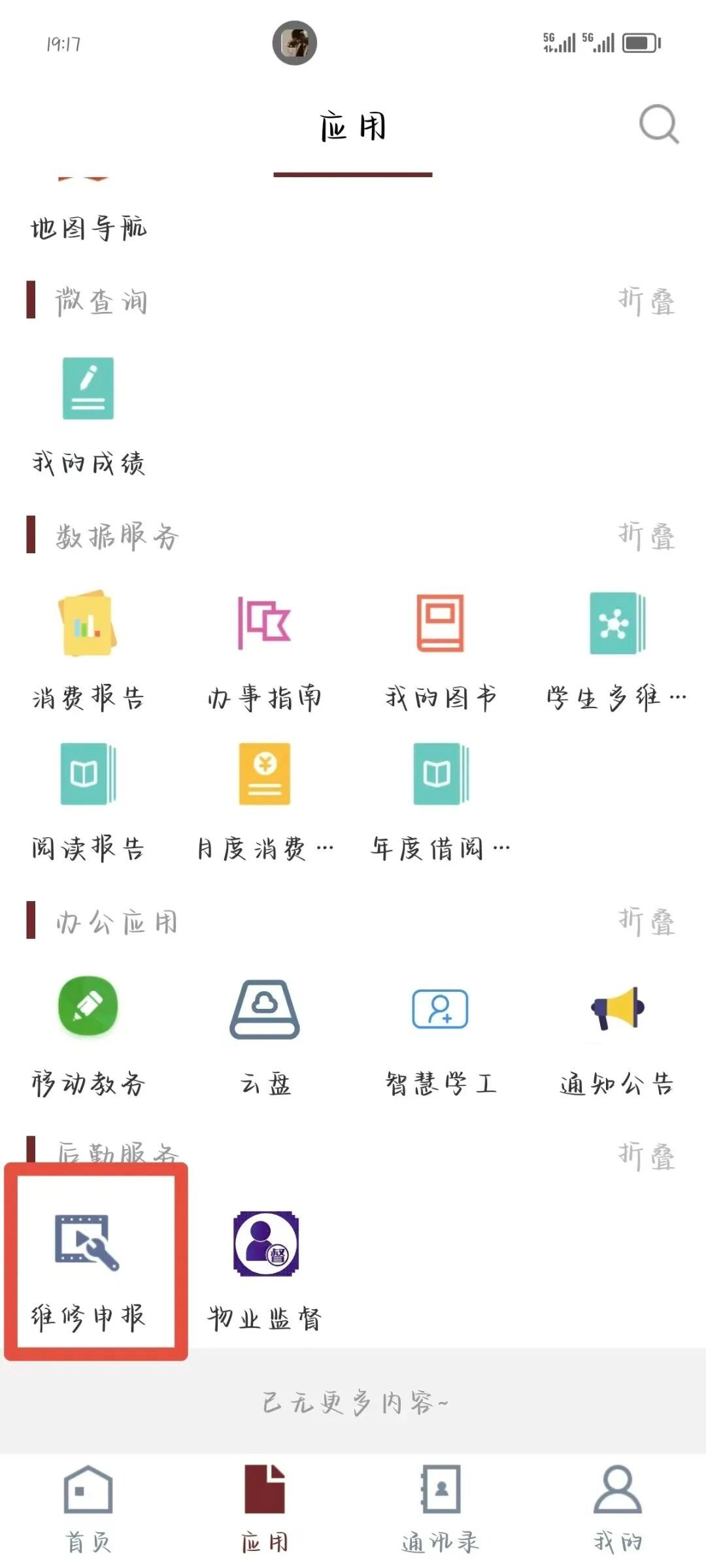 (1)登录APP成功后,点击“应用”,下拉找到“后勤服务”模块,点击“维修申报”,即可进行修。