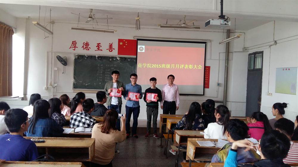 自上学期月月评班级考评制度推行以来,商学院在学生工作方面取得了巨大的进步。为表彰先进工作的班级,商学院特于4月12日在跬步楼1306召开了15班级月月评表彰大会。出席本次活动的主要有:党总支副书记尹金老师,团总支书记李自连老师,学生会全体成员,以及15级各班班长。