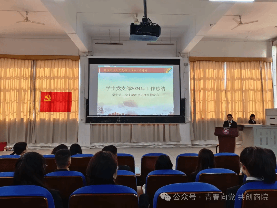 大会第六项,主持人公布新一届商学院学生党支部各部门部长名单,新一届学生党支部副书记、各部门部长和党员老师上台进行合影留念。大会第七项,由新一届学生第一党支部副书记张俊同志同志作2024年工作计划汇报计划分别从理论学习、党日活动、党员发展、党建联建等几个方面进行了详细规划,希望在新的一届学生党支部的带领下不断创新,充分发挥党员先锋模范作用,再创佳绩,再立新功。大会第八项,商学院学生第一党支部书记易晶晶同志作总结发言。她强调,要目标明确,勤奋学习;要时刻以党员的标准严格要求自己,发挥党员先锋模范作用,为中国特色社会主义的建设贡献自己的力量。最后,全体人员在跬步楼前合影留念。至此,本次大会圆满结束。
