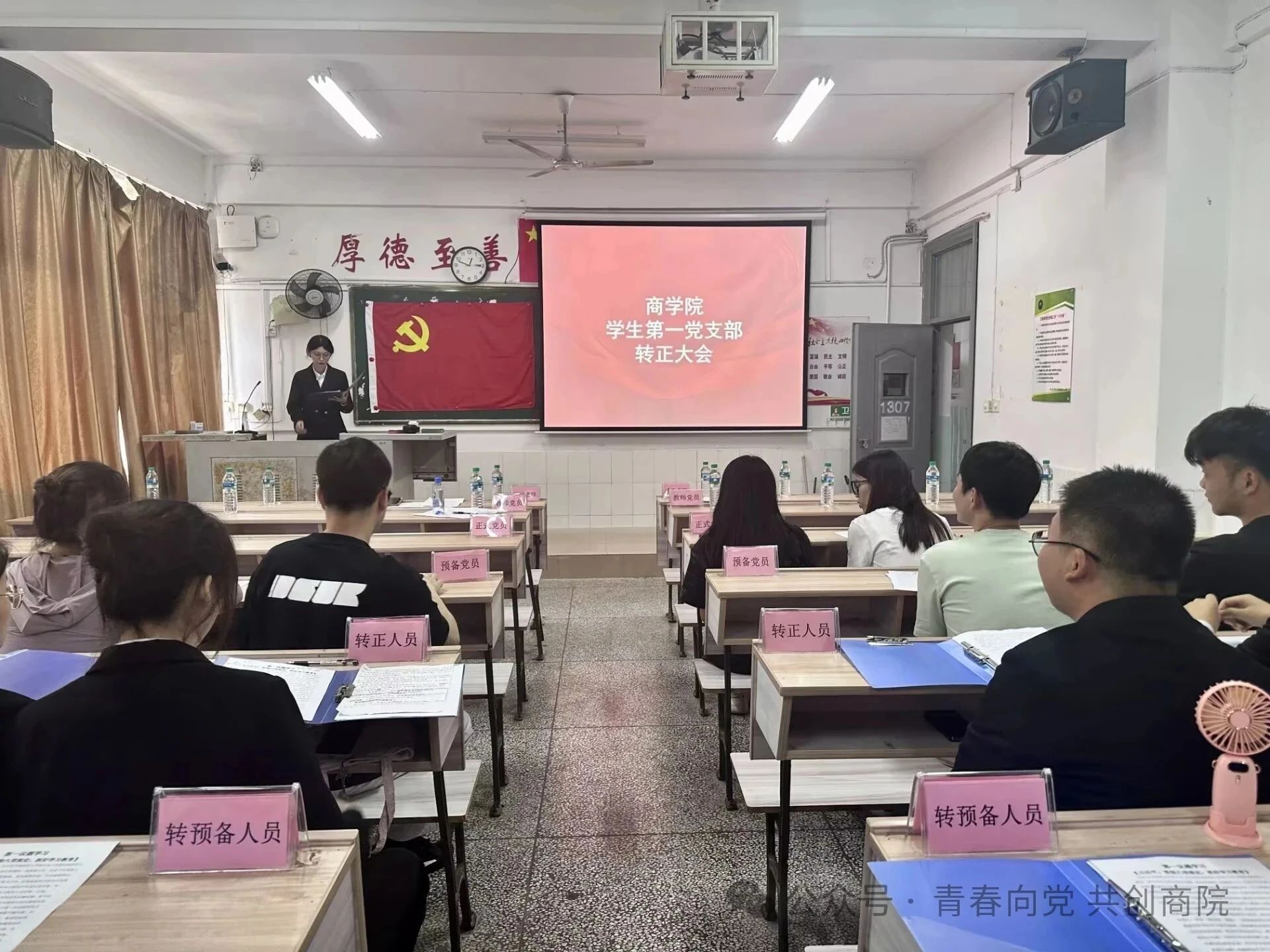 为全面做好新形势下党员发展工作,加强党支部的战斗力和凝聚力,严格把关党员发展质量。2025年5月31日12:10,商学院学生第一党支部采用线上线下相结合的方式在跬步楼1204党员活动室和1307教室举办转正发展大会。商学院学生第一党支部全体在校学生党员、转正人员、转正人员入党介绍人及学生第一党支部部分工作人员参与此次大会。本次大会由陈思琳主持。