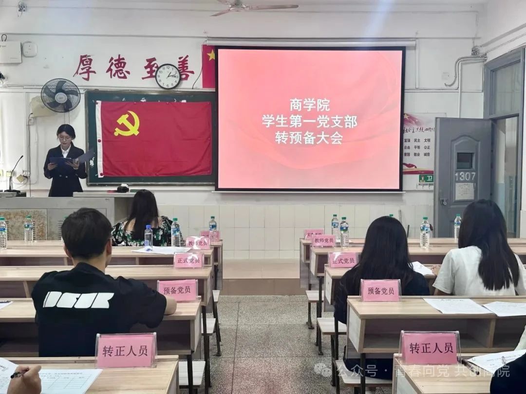 为扎实推进学生党员队伍作风建设,切实提升党员发展质量,持续增强党组织的凝聚力、战斗力和影响力。2025年6月3日12:10,商学院学生第一党支部于跬步楼1307教室举办转预备发展大会。商学院学生第一党支部全体在校学生党员、转预备人员、转预备人员介绍人同志、培养人同志以及部分学生第一党支部工作人员参与此次大会。本次大会由陈思琳主持。